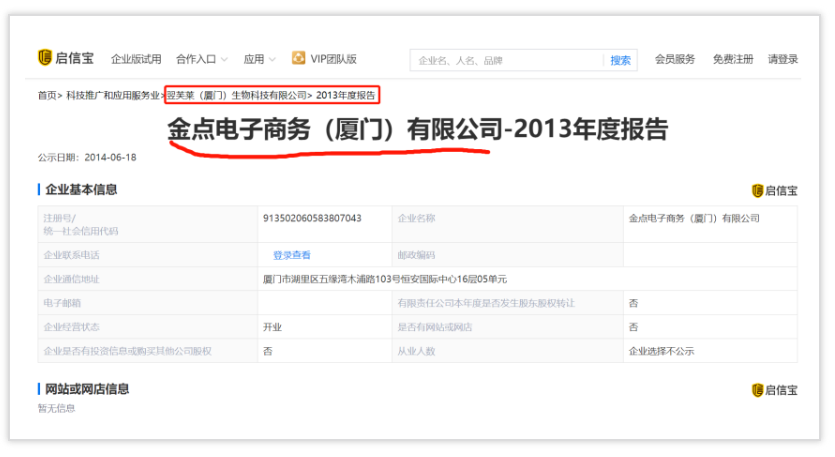 更可笑的是,在2014年的企業(yè)年報顯示,這家廈門翌芙萊的公司前生是一家叫做:金點電子商務(wù)(廈門)有限公司,可想而知做了兩年加盟商后就開始策劃走假冒品牌的路子。